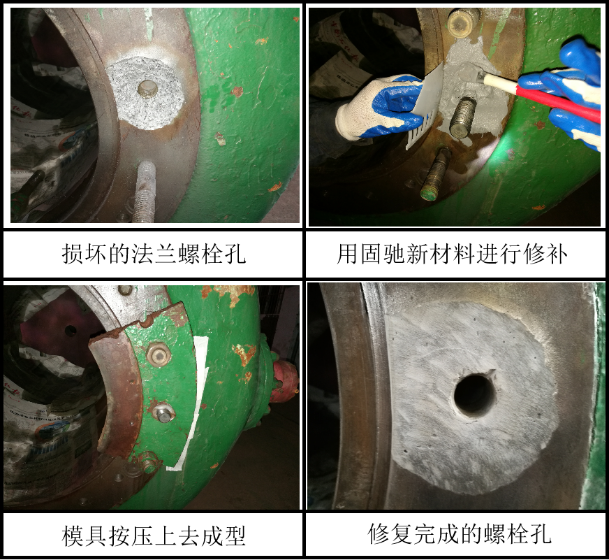 法兰面螺栓孔损坏,无法密封。使用固驰金属冷焊材料进行修复,避免更换整个法兰,节省了修复成本。