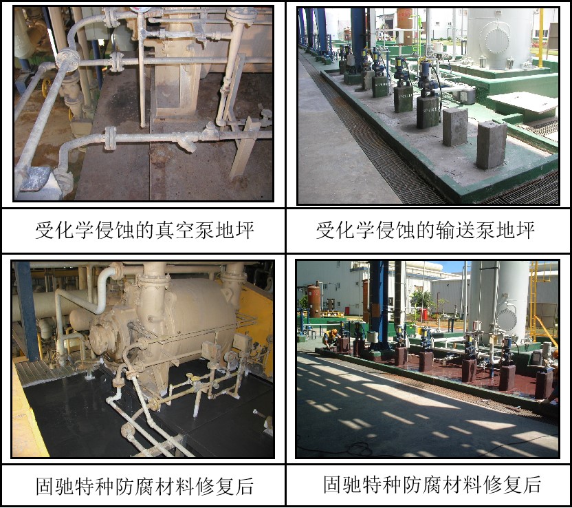 真空泵、硫酸输送泵浦机座因长时间受醋酸、硫酸等化学物质侵蚀造成机座水泥损坏。涂覆固驰高性能特种防护材料后,地坪完整性改善且抗化学腐蚀性、抗压性以及耐衝击性更为优越。