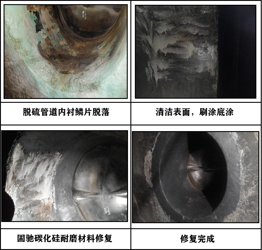 该发电公司脱硫系统的某段浆液管道原先用玻璃鳞片进行防腐处理, 管道直径约 1 米,运行一段时间后,玻璃鳞片局部被腐蚀穿透,影响到管道的金属本体。我司受电厂委托,去除残破的玻璃鳞片,用高分子碳化硅耐磨防腐涂层材料进行了高效率的现场修复。