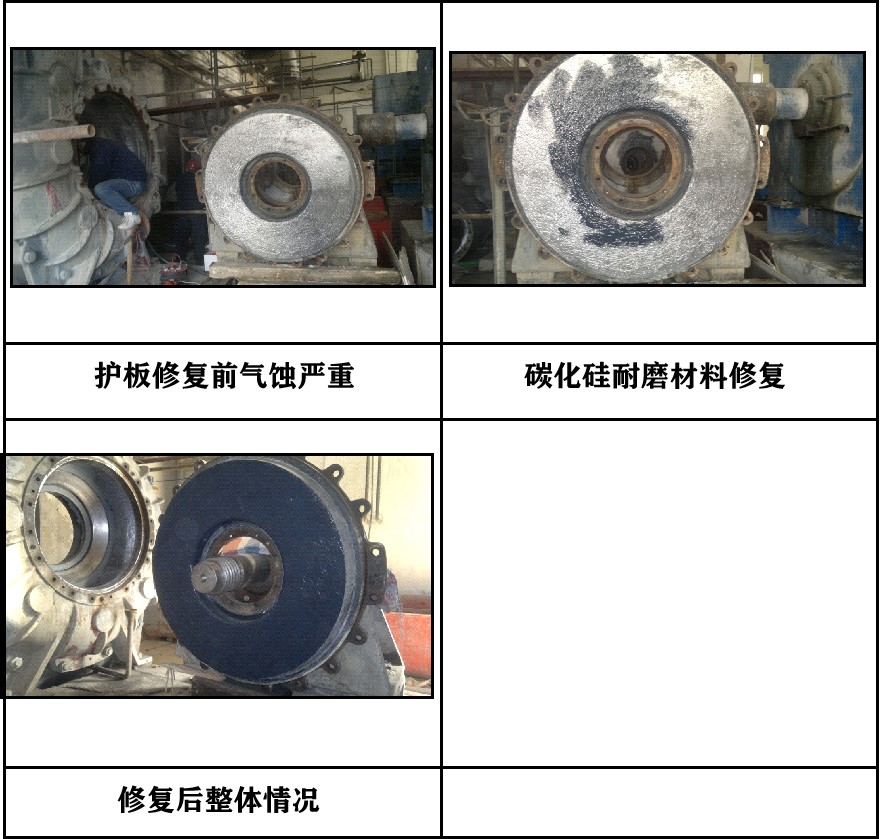 产品特点:使用固驰耐磨材料修复气蚀严重的脱硫循环泵护板