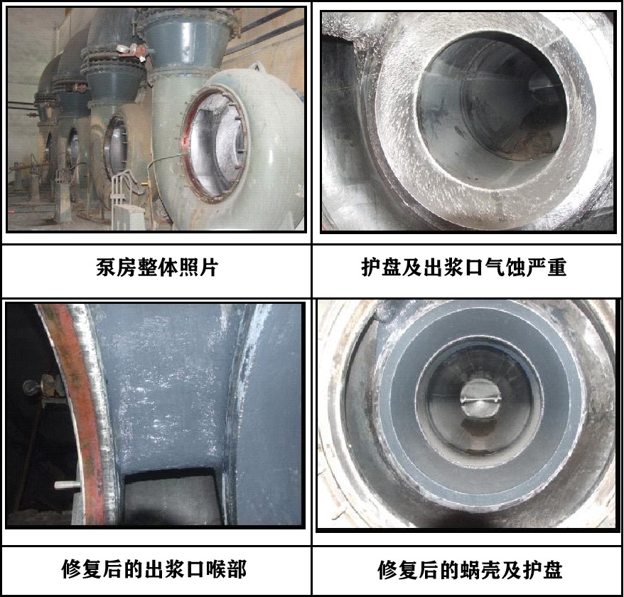 某发电企业脱硫循环泵蜗壳,运行一年后,出浆口和蜗壳护盘气蚀严重。使用固驰表面重塑材料修复后,耐磨性大大提高。