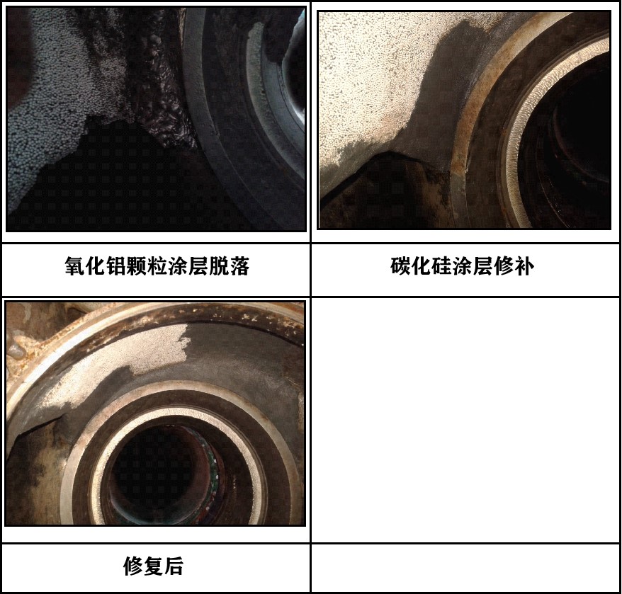 某大型炼化有限公二号电站,泵壳原先采用氧化铝颗粒材料进行过修复,运行一年后,陶瓷涂层较大面积脱落,泵壳口环部位磨损非常严重,造成壳体螺栓部位局部穿孔。无法使用。使用固驰的修复方案后,24小时内恢复工作。