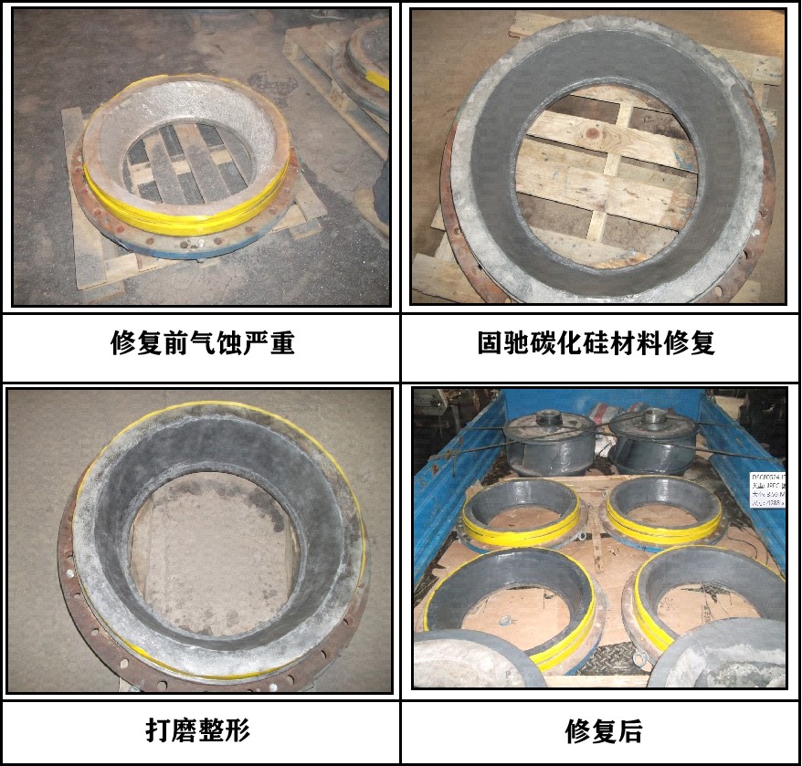 产品特点:使用固驰碳化硅材料修复气蚀严重的脱硫循环泵前护板